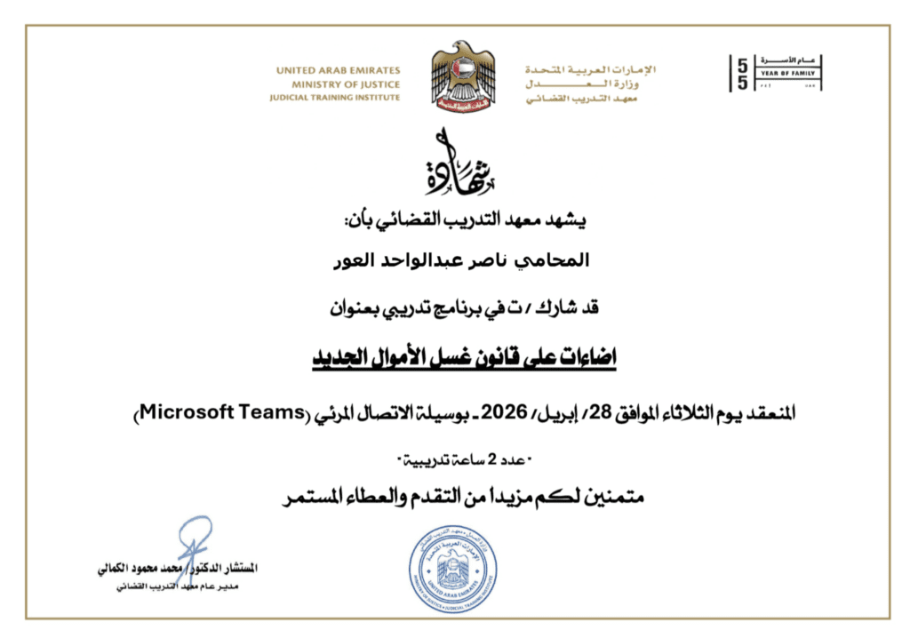 شارك المحامي ناصر العور في البرنامج التدريبي بعنوان “إضاءات على قانون مواجهة غسل الأموال الجديد”، والذي عُقد بتاريخ 28/04/2026 ونظمه معهد التدريب القضائي بالتعاون مع إدارة مواجهة غسل الأموال ومكافحة الإرهاب