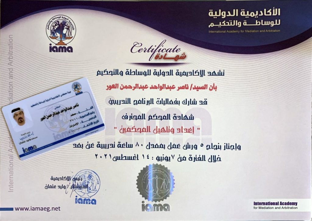 Nasser Alawar Advocates & Legal Consultants Office happy to announce that lawyer Nasser AlAwar has passed the arbitration course and obtained the Professional Arbitrator Certificate from the International Academy of Mediation and Arbitration, which was held from 07/06/2021 to 14/08/2021.